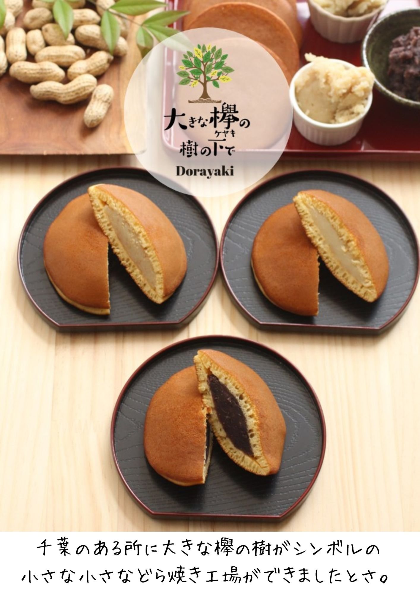 全3種大きな欅の樹の下でどら焼き小倉(270円)、ミルク(302円)、ピーナツ(...