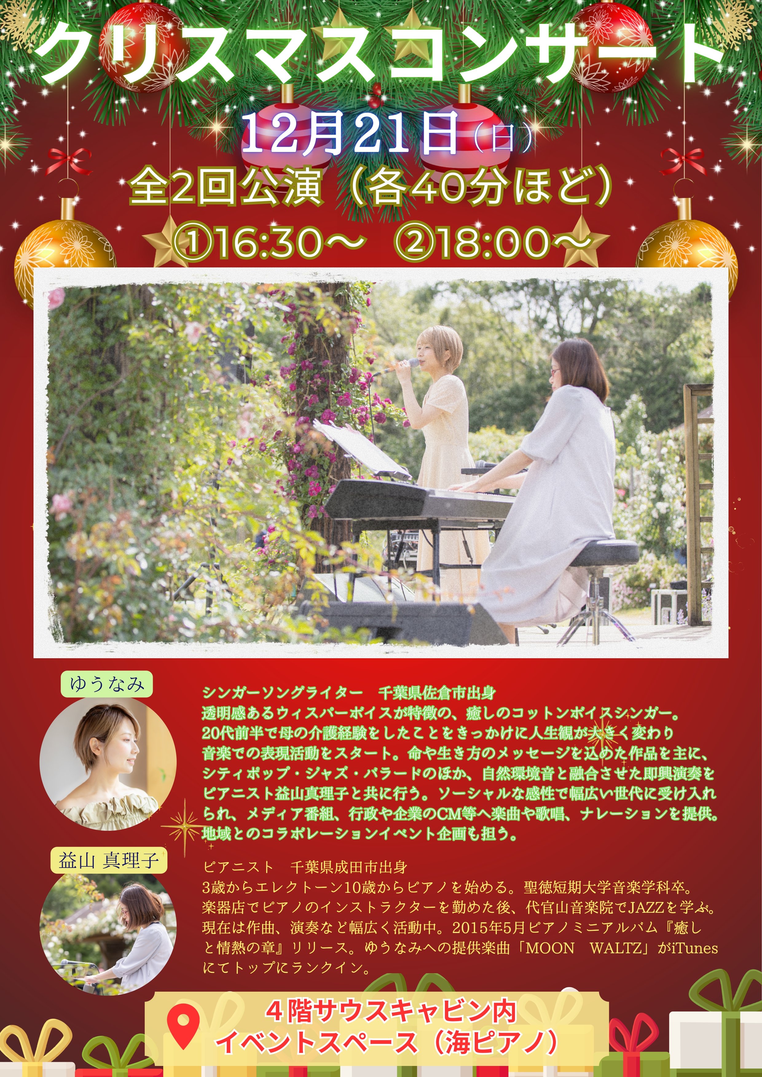 ◆日時:12/21(日)16:30~/18:00~(各40分程) ◆場所:4Fサウスキャビン内 海ピアノ ◆出演者:ゆうなみ(ボーカル)/益山 真理子(ピアノ) ◆観覧無料 ◆備考:イベント開催に伴い、11:00~20:00は海ピアノをご利用できません。