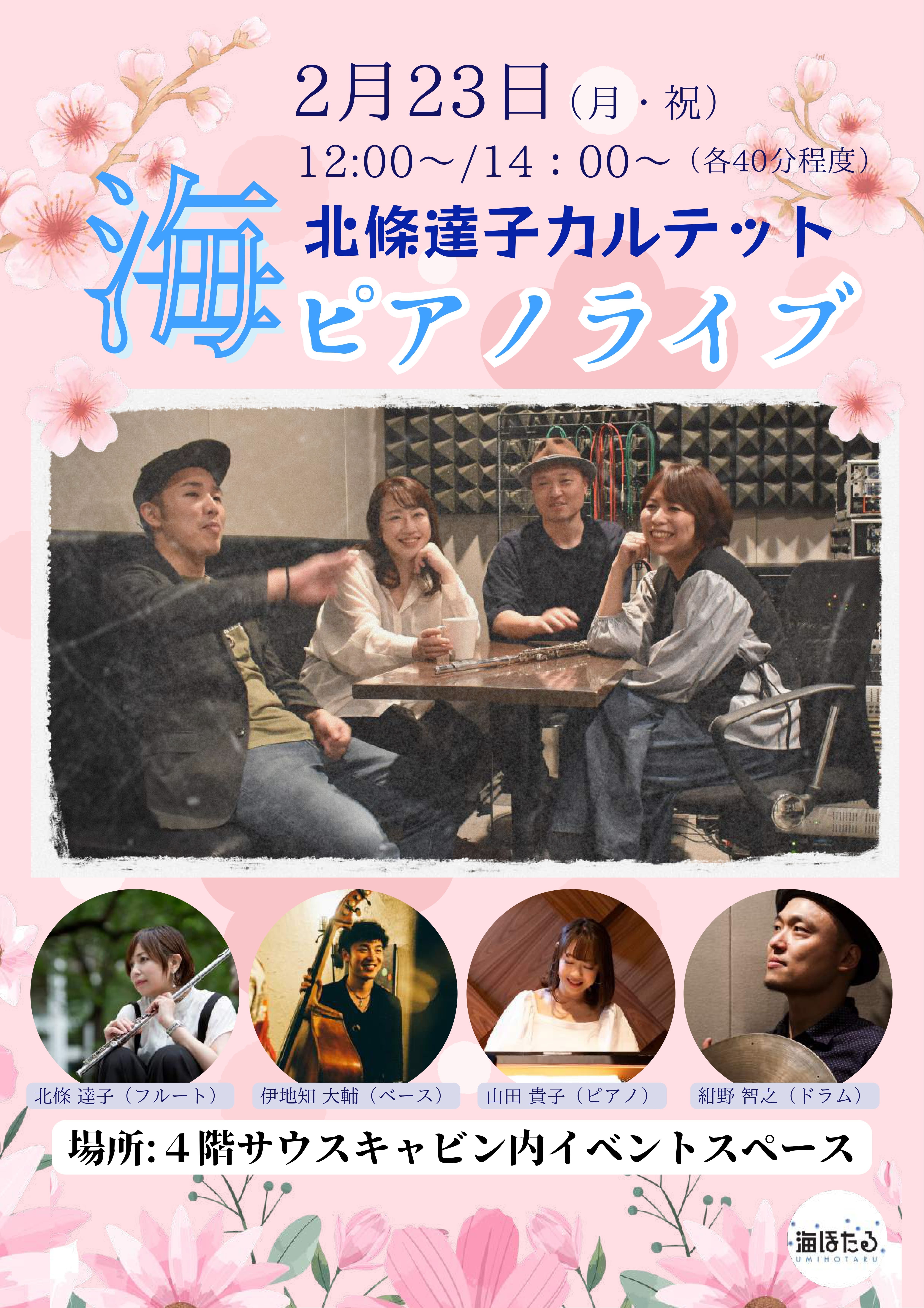 海ほたる常設のストリートピアノ「海ピアノ」にて「北條達子カルテット」によるライブを行います。