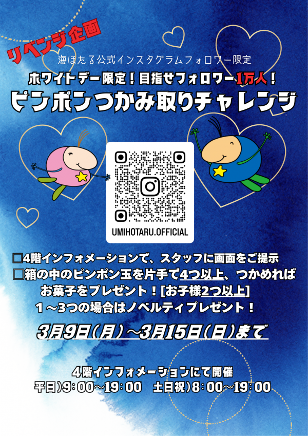 3月9日(月)から15日(日)まで、海ほたるパーキングエリアではホワイトデー限定企画と題して、「ピンポンつかみ取りチャレンジ」を開催いたします!